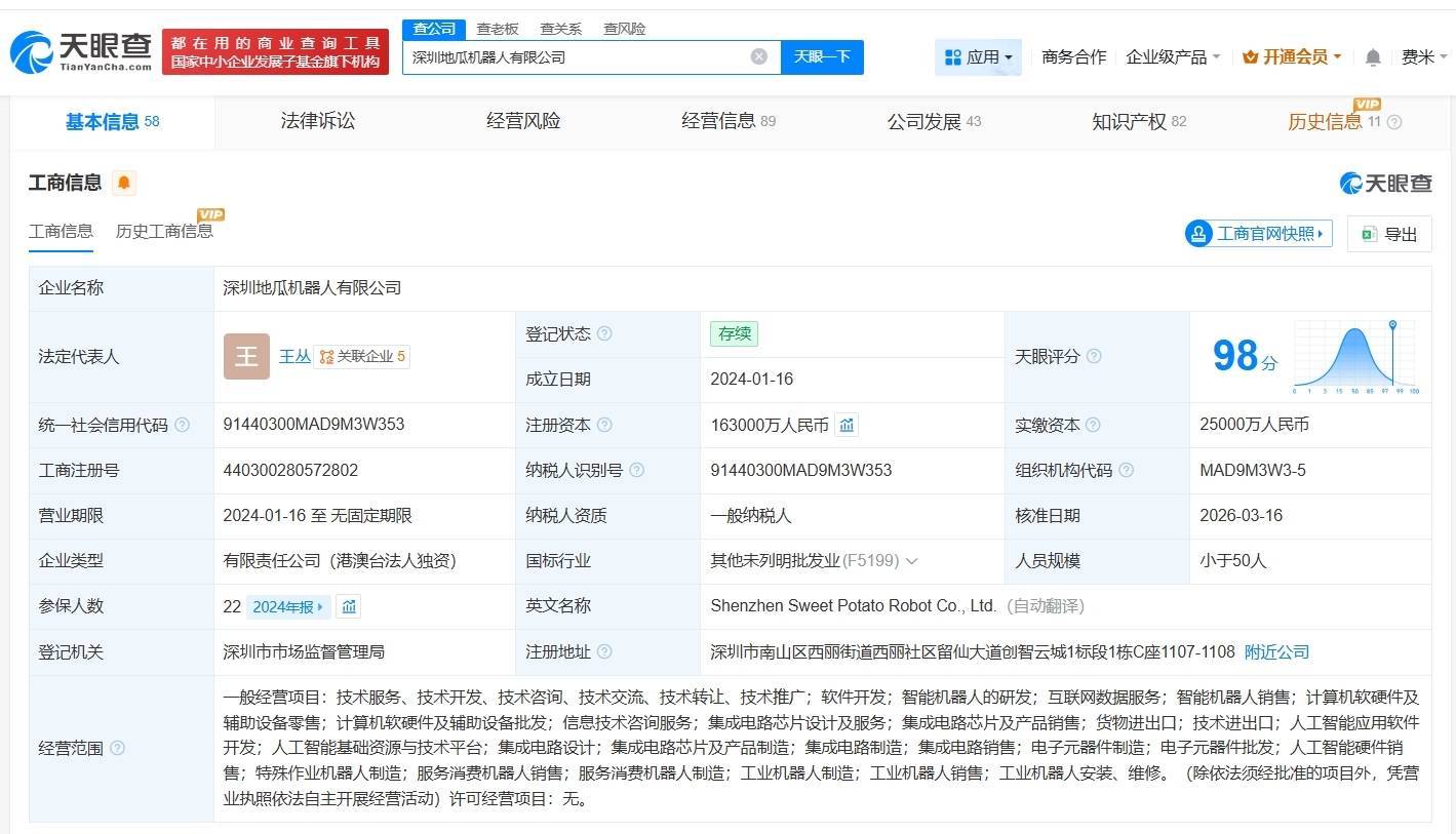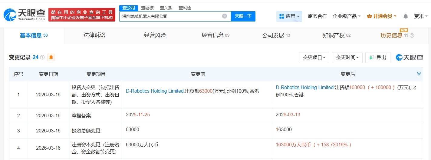 南方财经3月23日电,天眼查App显示,近日,深圳地瓜机器人有限公司发生工商变更,注册资本由6.3亿人民币增至16.3亿人民币,增幅约159%。深圳地瓜机器人有限公司成立于2024年1月,法定代表人为王丛,经营范围包括智能机器人的研发、集成电路芯片设计及服务、人工智能应用软件开发等。股东信息显示,该公司由D-RoboticsHoldingLimited全资持股。